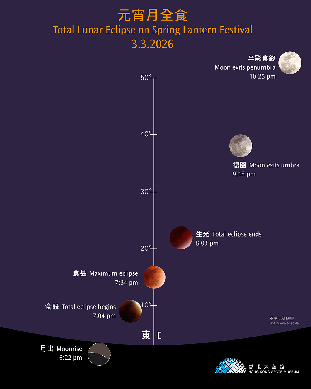 The Moon rises at 6:22 pm on 3 March 2026, when part of the Moon has already entered the Earth’s umbra. The total phase of the lunar eclipse begins at 7:04 pm, when the Moon enters Earth's umbra completely, and will last approximately 59 minutes. The subsequent partial phase of the lunar eclipse will end at 9:18 pm. The next total lunar eclipse with total phase of the lunar eclipse visible from Hong Kong will occur on 1 January 2029.